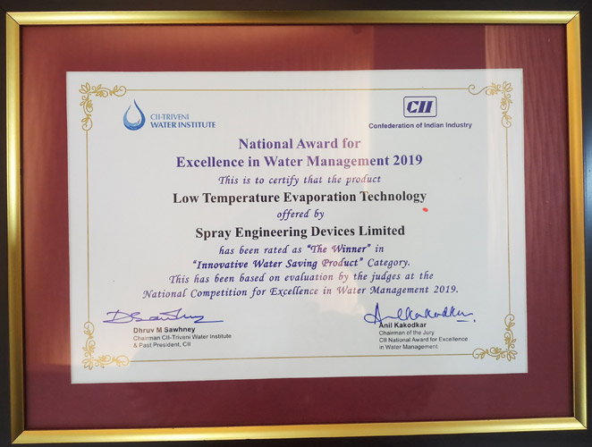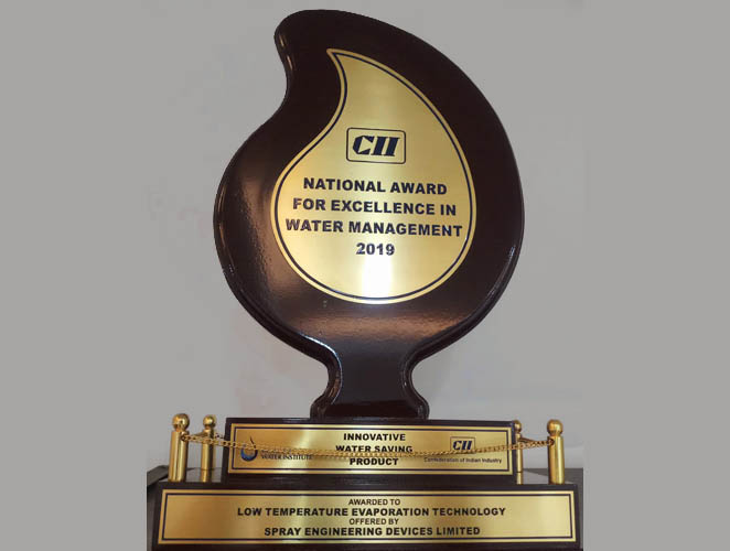 September 19, 2019, Spray Engineering Devices Limited is the Winner of "National Award for Excellence in Water Management 2019" for Low Temperature Evaporation Technology under Innovative Water Saving Product Category in CII-5th Water Innovation Summit 2019, New Delhi.