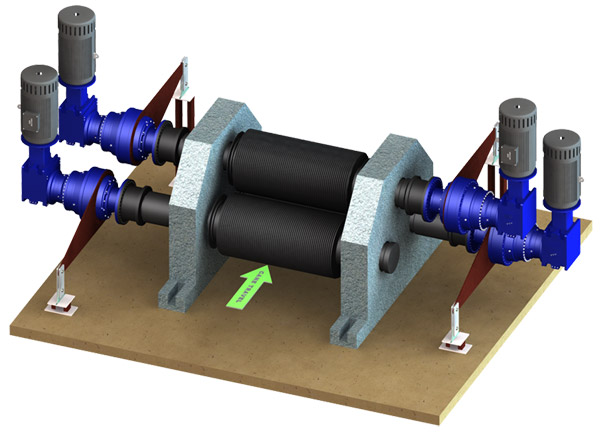 In SED of mill drive system, top roller of the mill has a drive at either end, directly mounted on its shaft. Each of the other rollers has one drive directly mounted on its shaft. This system is equipped with variable frequency drives to control the mill speed very precisely.