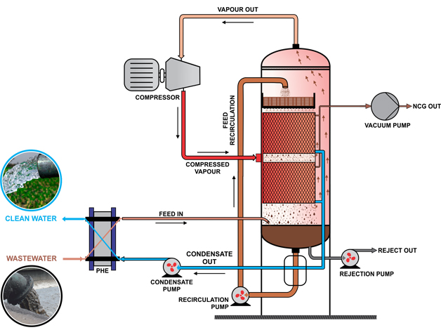 Spray Engineering Devices Limited (SED) has revolutionized the water sector by providing most efficient water recovery and recycling solution using low temperature evaporation technology based on mechanical vapour compression/recompression system in single step. This evaporation technology is operating on compressed vapour without use of external heat source i.e. boiler, turbine, cooling water etc. thus eliminating use of heat generation unit (Fossil & Non-Fossil Fuel Boiler) and heat rejection unit (Condenser and Cooling Tower). The technology is highly efficient and eco-friendly falling film evaporator with mechanical vapour compression/recompression system for concentration of any type of industrial effluent or domestic wastewater.